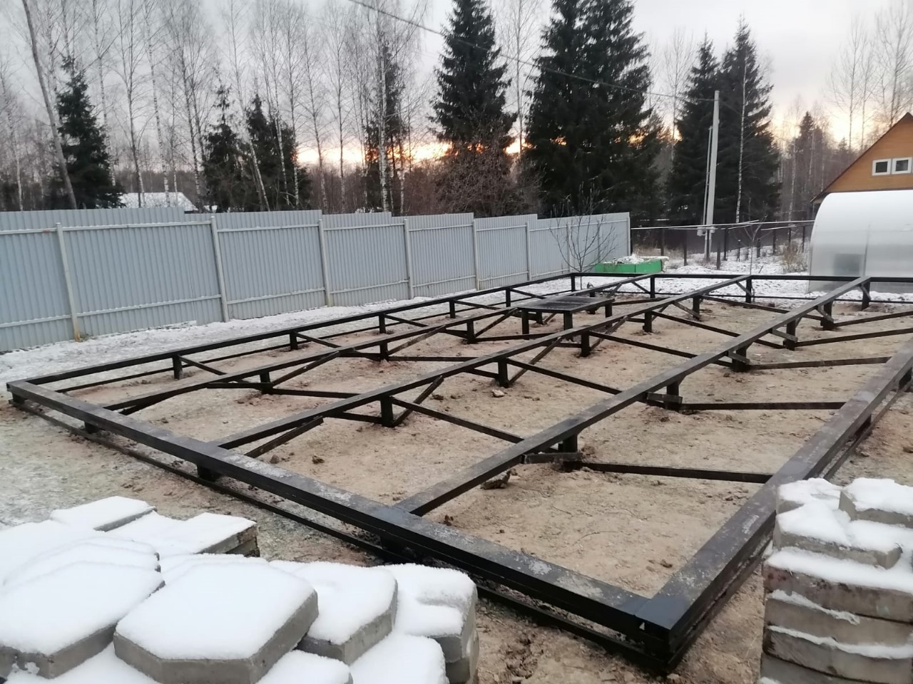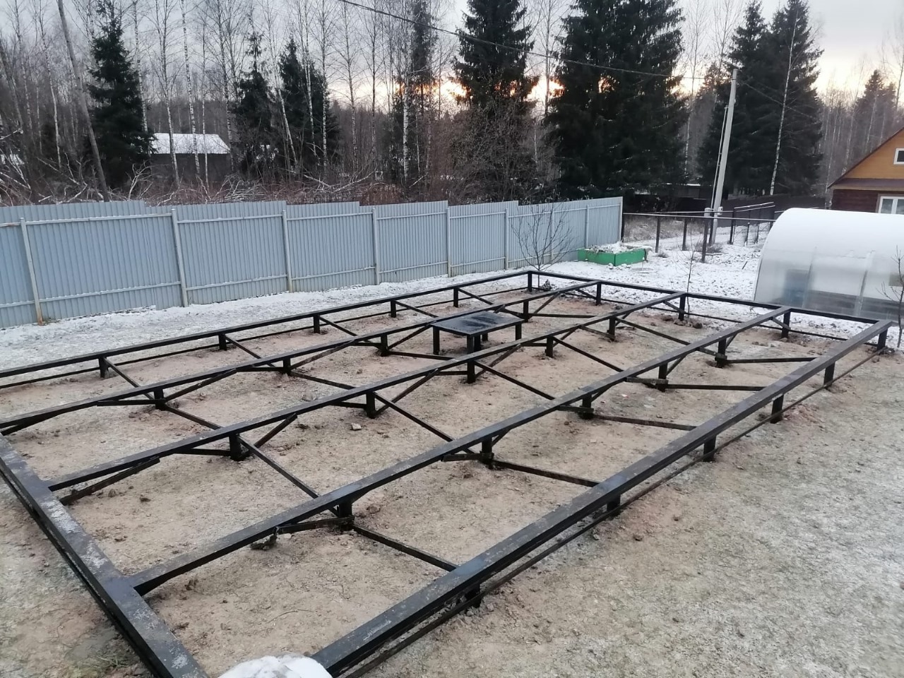 Фундамента на сваях в зимний период - 40 винтовых свай с укосинами и обвязкой швеллером